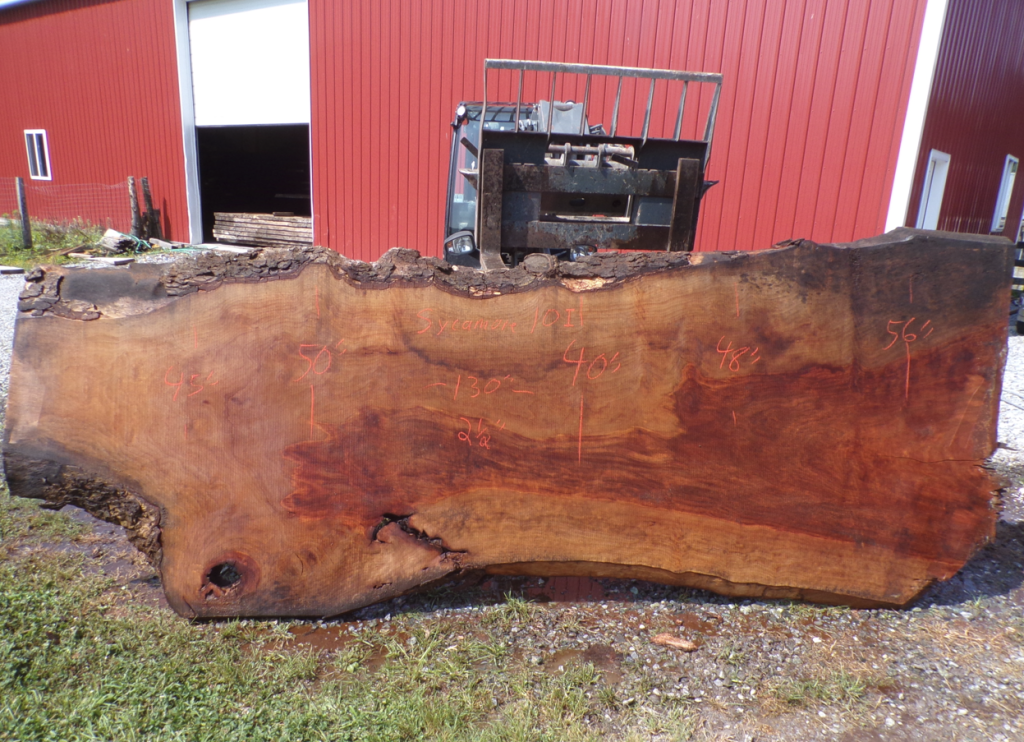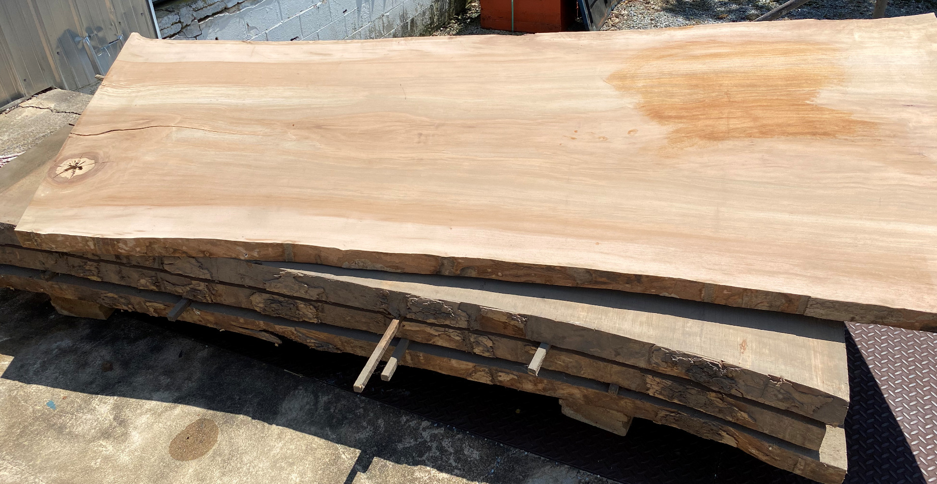 Most of sycamore slabs are all 2 1/4″ thick or more when rough cut. They tend to lose about 1″ of their thickness if planed and sanded in one piece. If they’re cut in half, they will not lose as much. We have sycamore slabs in a wide range of sizes. Some of our slabs reach 50"+ in width. These slabs are rough cut, so the ends will need to be squared and they will all need to be planed and sanded to use for a dining table or other piece of furniture.