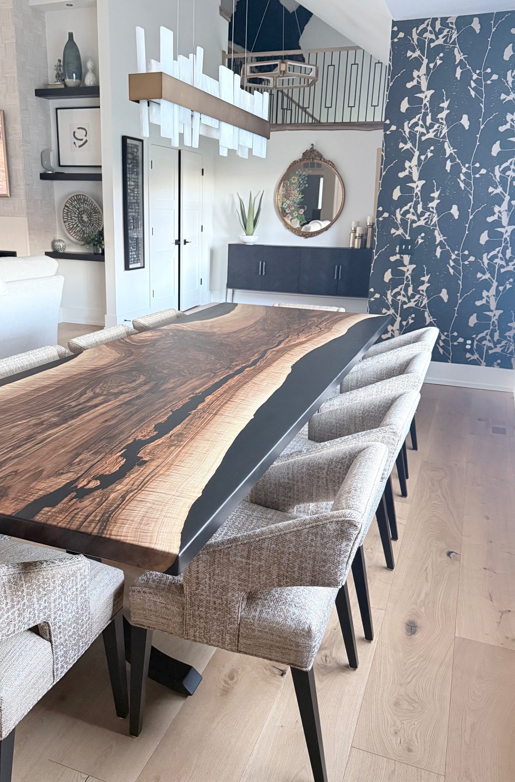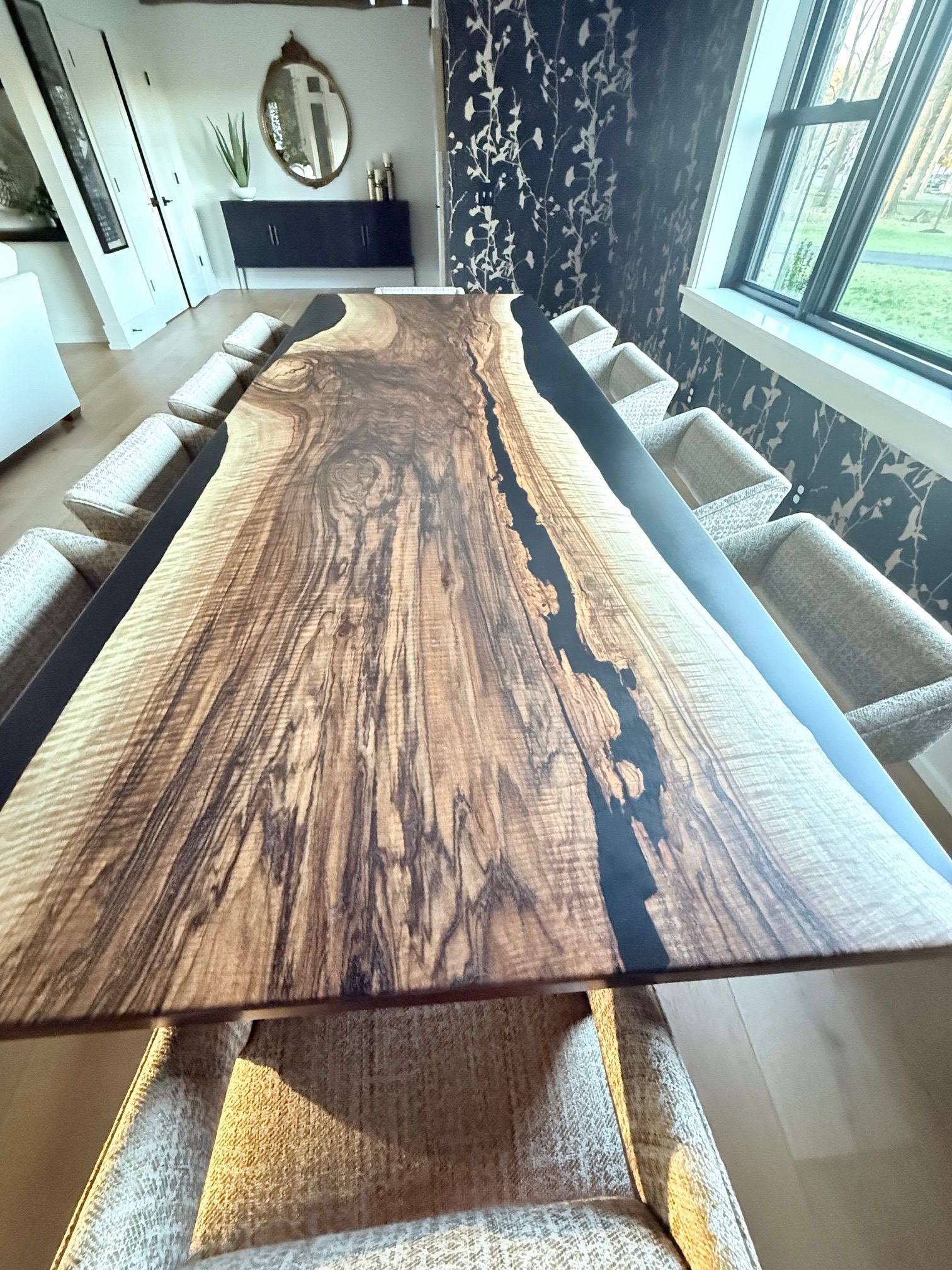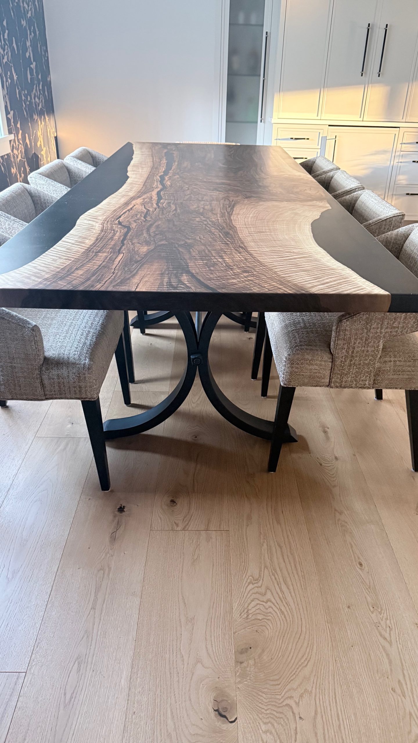 10′ x 44″ English walnut with black epoxy reverse river table.