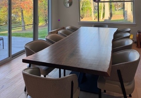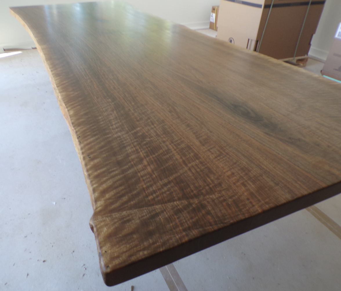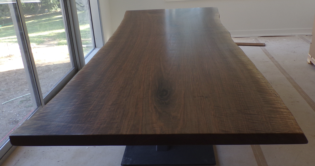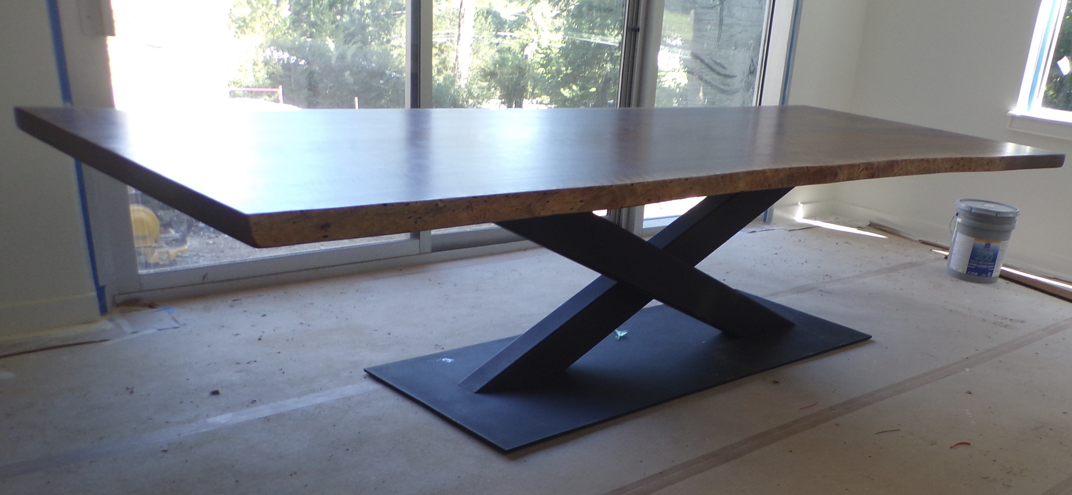11’x 45″-52″ live edge Bastogne walnut table with unique heavy duty black metal base.