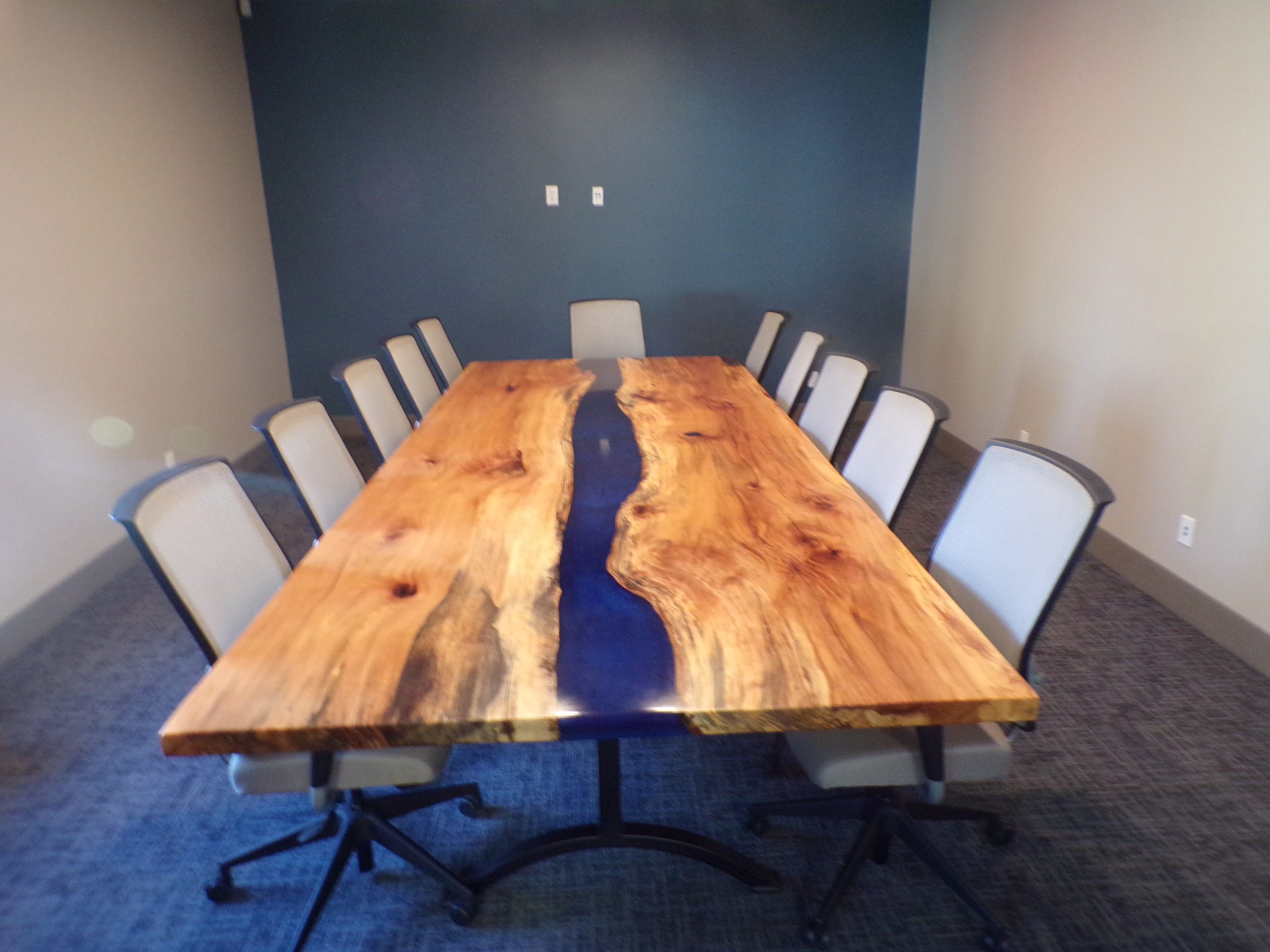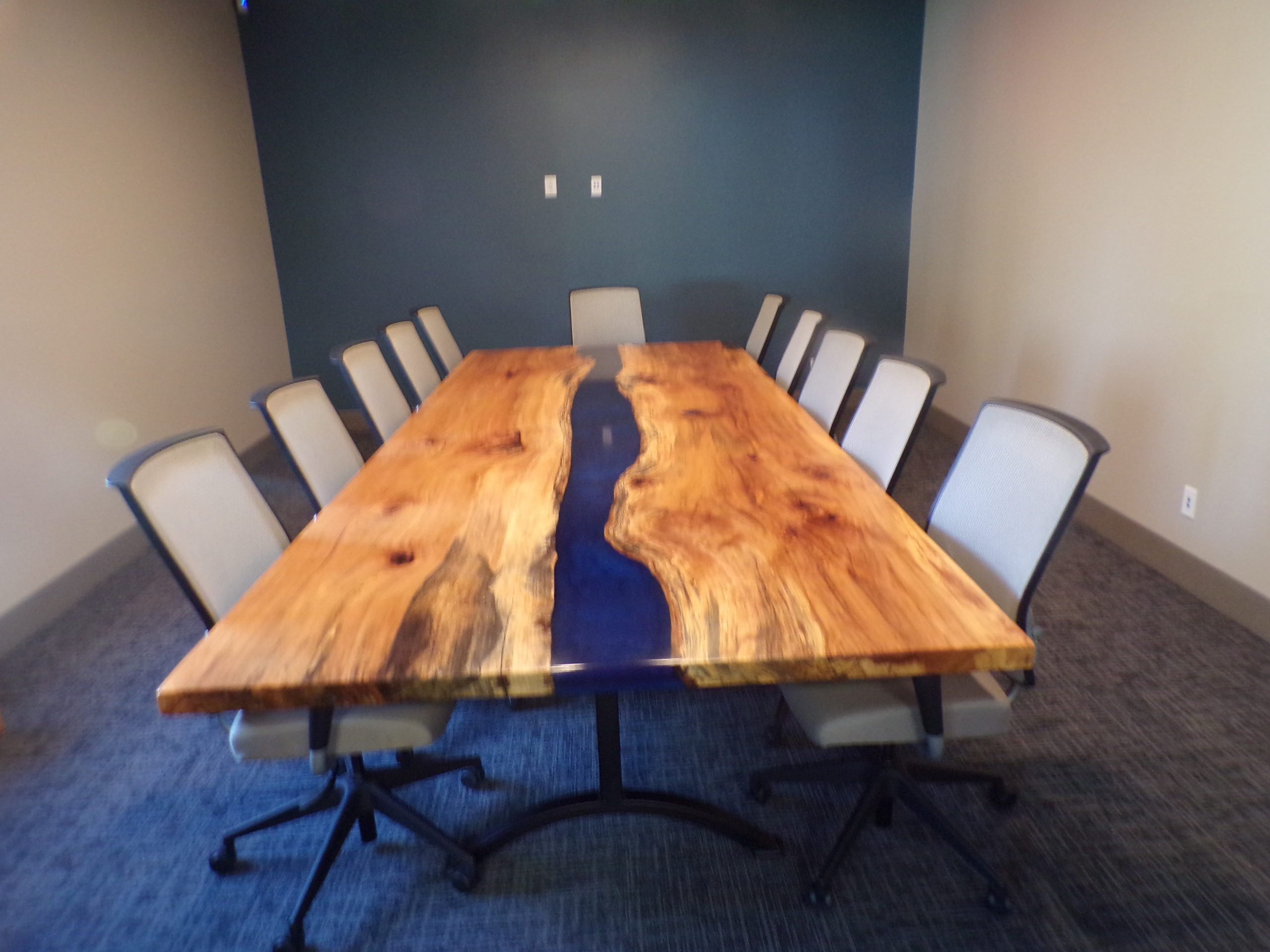 conference room table:12′ x 5′ Spalted sycamore with blue epoxy river