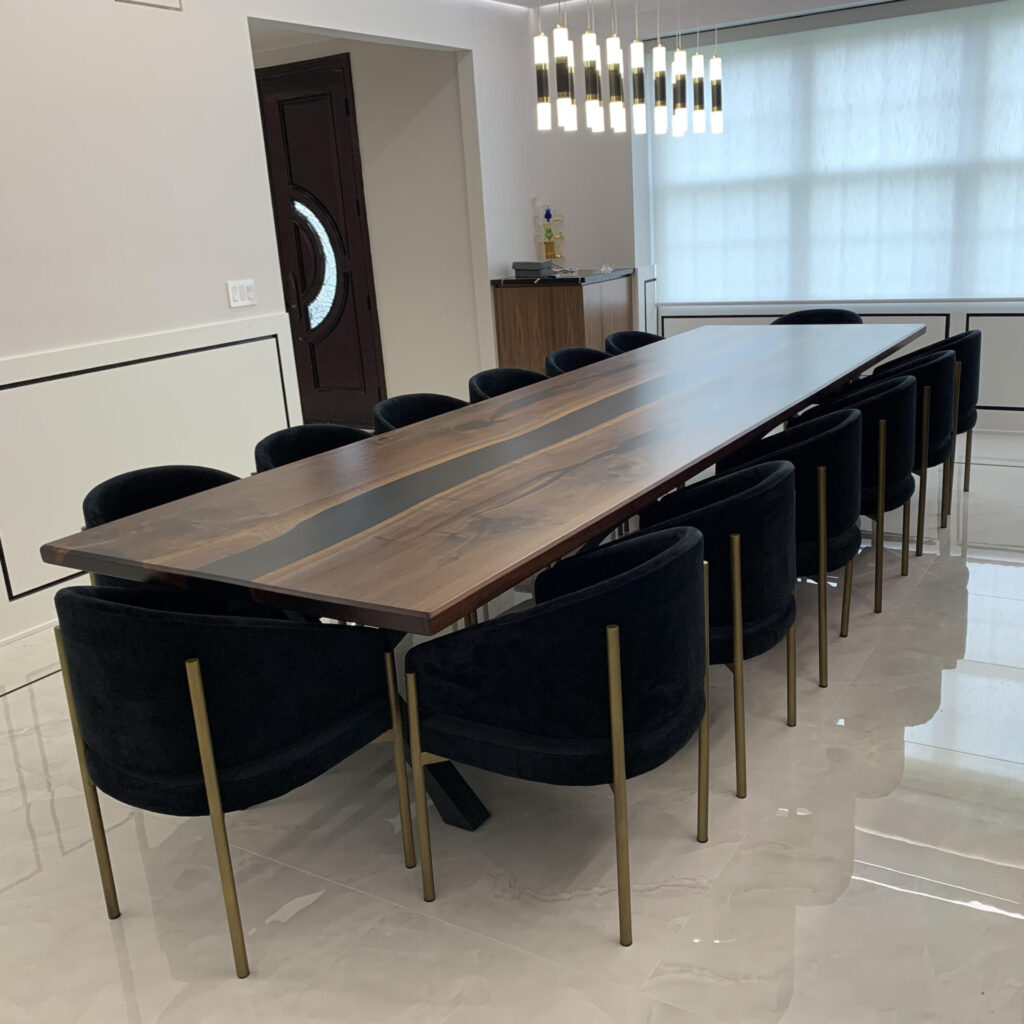 For this customer, we made a totally custom 14′ long table. This is one of our biggest epoxy tables to date! It features a hardwax oil finish. The customer purchased this table so they could seat up to 14 people in style! Though this walnut river table is sold, you can get a quote on your next table here!