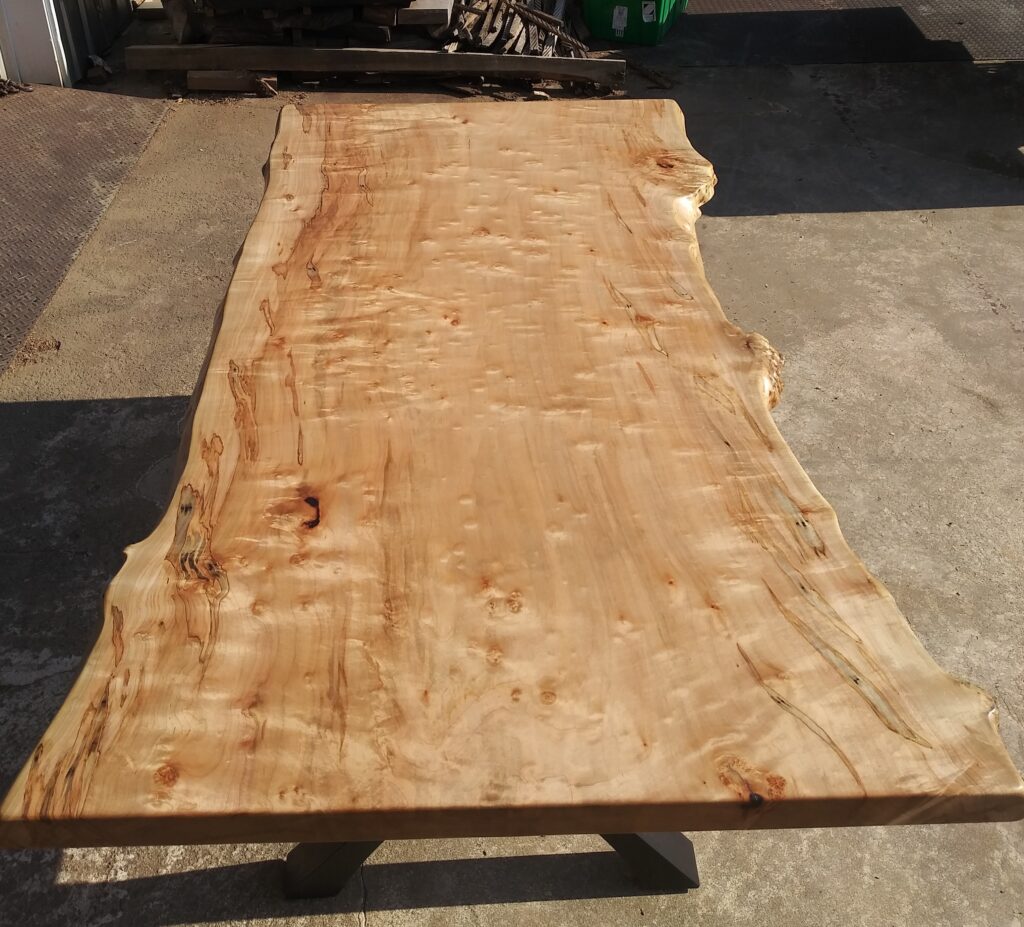 This curly maple table is 6 feet long and between 33″ and 36″ wide. The legs are black metal curved X shaped legs made locally by Morris Hill Metal.