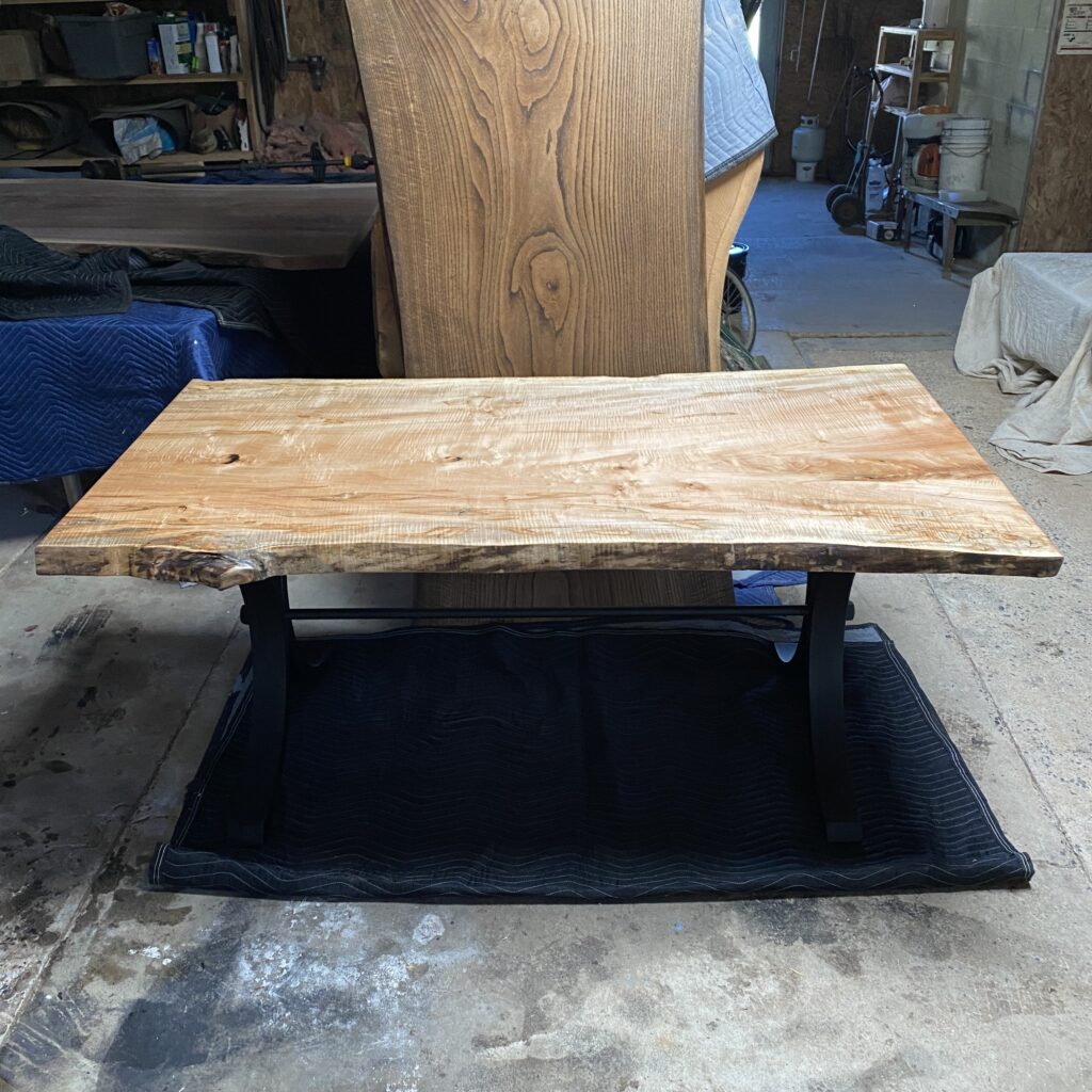 This table features a set of metal table legs and an LED hardwax oil finish on a really unique maple live edge slab. The slab used for this has areas of spalting, ambrosia, and curls. Very rarely do we get all 3 of these unique patterns on a single slab. The slab finished out to be exactly 6′ long and is a really straight piece of maple as it measures around 35″ across the width of the slab. The piece used finished out at 2″ thick. All of the cracks and knots were filled with a black epoxy to give it a smooth, mirror-like finish.