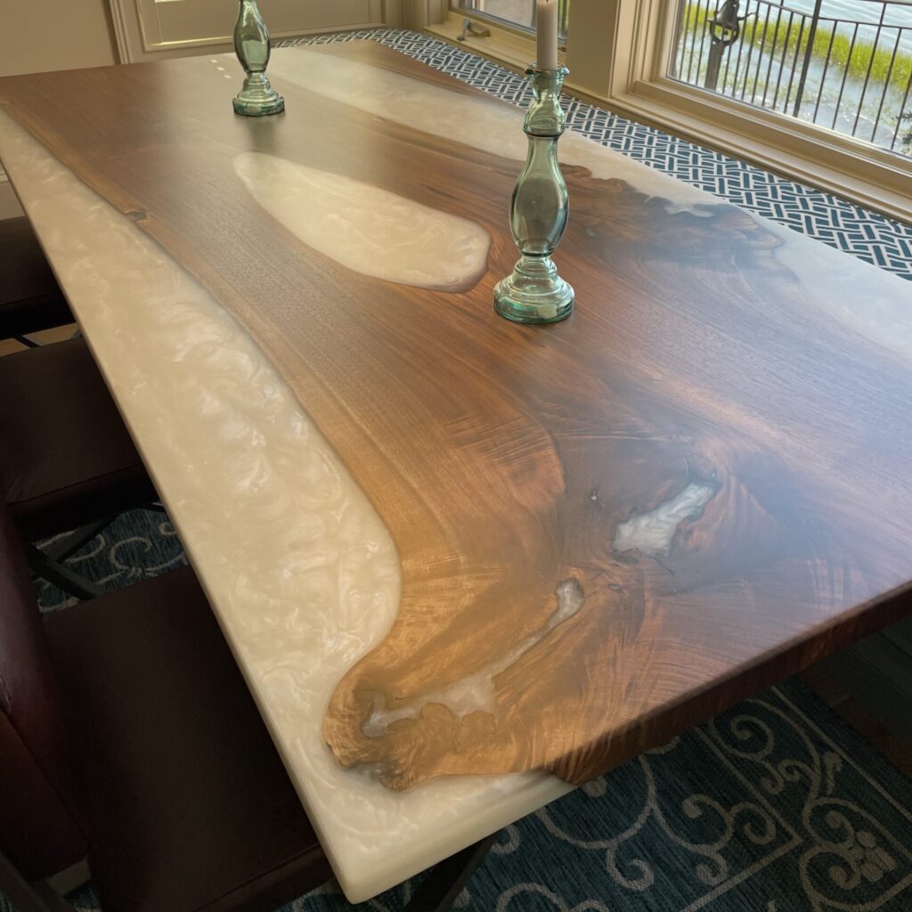 This table measured 40″x7′ – but we can make them in any size! This was built using a black walnut live edge slab and over 10 gallon of epoxy with white pigment. It fits perfectly in our customer’s home!