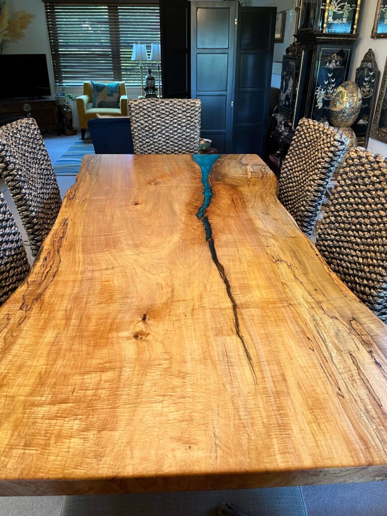 Spalted Maple Table features a partial river from one end which is caused by a natural crack from big branch coming off the side.