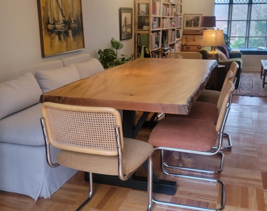 this is a beautiful 88”x 39” sycamore table with unique metal legs. For a similar table contact us for a quote