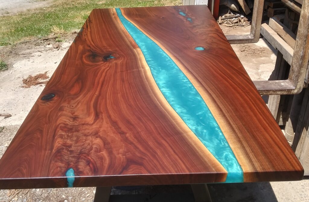 Walnut Table is accented with an emerald green and blue epoxy to create a smooth and striking presentation.