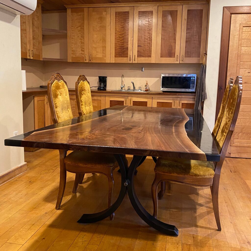This beautiful live edge slab table was made from black walnut. We used a custom metal base that’s extremely sturdy. Around the live edge slab is black epoxy, which was poured to make the table a rectangle. When the top has epoxy poured around the slab, it’s referred to as a “reverse river” table. The tabletop measures 96″ (or 8′ ) long, by 44″ (or 3′ 8″ ) wide. It sits 30″ from the ground. Chairs were not included with the purchase.