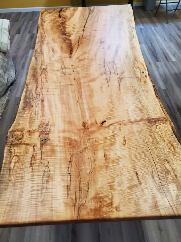 This table is made out of a highly figured maple live edge slab that has a little bit of everything, some ambrosia, some spalting, some crotch feathering and a lot of beautiful curl !! It is finished with Rubio Monocoat and Nano3 from Blacktail Studio. This is a beautiful table that will be a great center piece to any room.