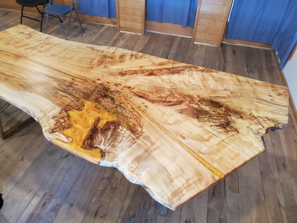 This live edge maple table was specially made as our office conference table.  It features a massive 9′ long by 36-52″ wide maple slab with tons of figure and character in the wood.  This slab features a very unique live edge that varies from 36″ on one end to 52″ on the other end.  This slab was finished with our LED hardwax oil.  The voids and cracks are filled with gold epoxy.  The legs were found on Etsy.  For a similar table, contact us for a quote.