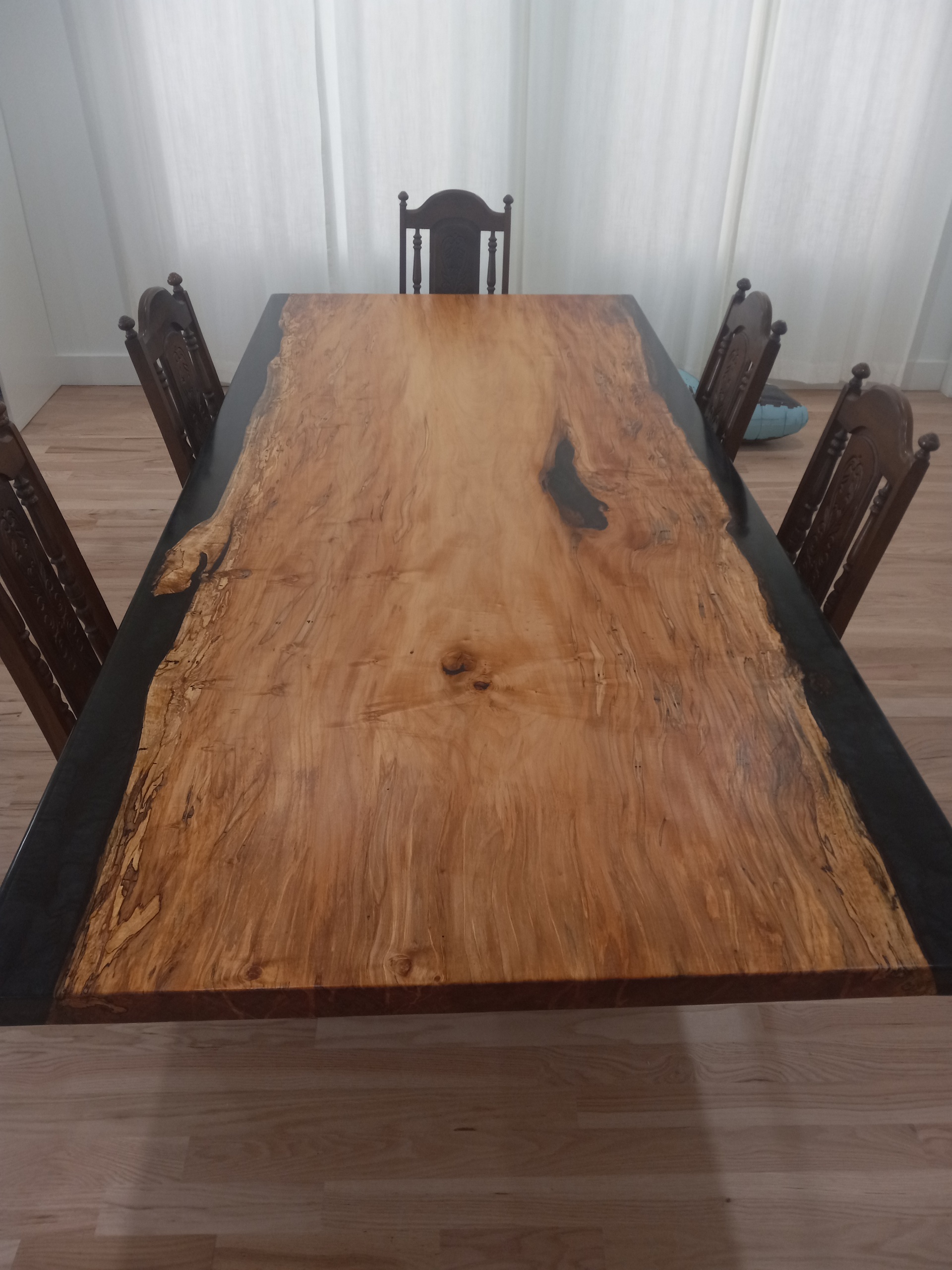 9’x 48″ maple and epoxy table.